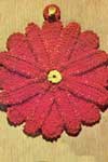 Starting at center, ch 2. 1st rnd: 6 sc in 2nd ch from hook. 2nd rnd: 2 sc in each sc around. 3rd rnd: * Sc in next sc, 2 sc in next sc (1 sc increased). Repeat from * around. 4th rnd: Sc in each sc around, increasing 6 sc evenly around. Repeat 4th rnd until piece measures 6 ½ inches in diameter, half dc in next sc, dc in next sc, tr in next sc, d tr in next sc, tr in next sc, dc in next sc, half dc in next sc, sc in next sc, sl st in next sc. (More)